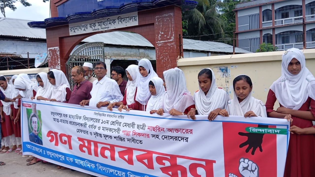 পিরোজপুরের নাজিরপুর উপজেলায় চিরকুট লিখে আত্মহত্যা করা ১০ম শ্রেণির স্কুলছাত্রী নাসরিন আক্তারের মৃত্যুর ঘটনায় অভিযুক্ত পান্না শিকদারের ফাঁসির দাবিতে মানববন্ধন করেছেন বিদ্যালয়ের শিক্ষক, সহপাঠী ও স্থানীয়রা।