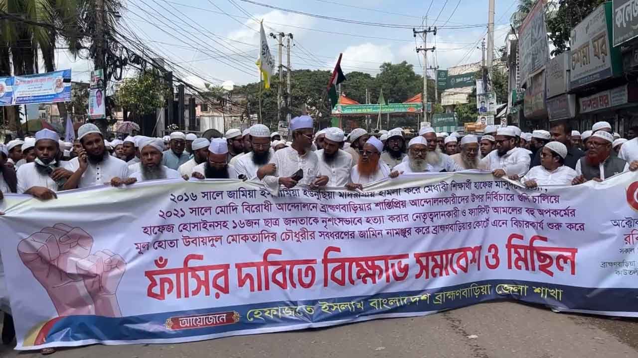 সাবেক গৃহায়ণ ও গণপূর্ত মন্ত্রী র. আ. ম. উবায়দুল মুকতাদির চৌধুরীর ফাঁসির দাবিতে বিক্ষোভ মিছিল ও সমাবেশ করেছে হেফাজতে ইসলাম বাংলাদেশ ব্রাহ্মণবাড়িয়া জেলা শাখা। রোববার (৫ অক্টোবর) বেলা সাড়ে ১১টার দিকে