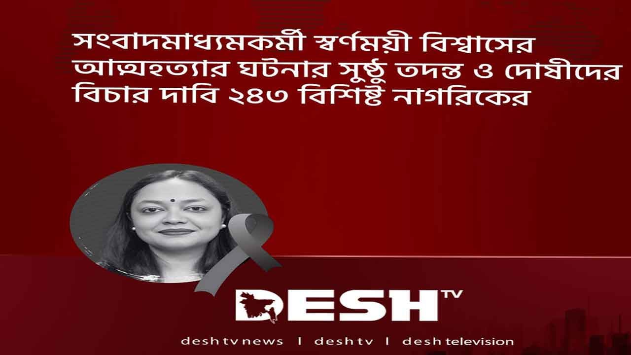 অনলাইন নিউজপোর্টাল ঢাকা স্ট্রিম-এর গ্রাফিক ডিজাইনার স্বর্ণময়ী বিশ্বাসের আত্মহত্যার ঘটনার সুষ্ঠু তদন্ত ও দোষীদের বিচার দাবি জানিয়েছেন দেশের ২৪৩ জন বিশিষ্ট নাগরিক।