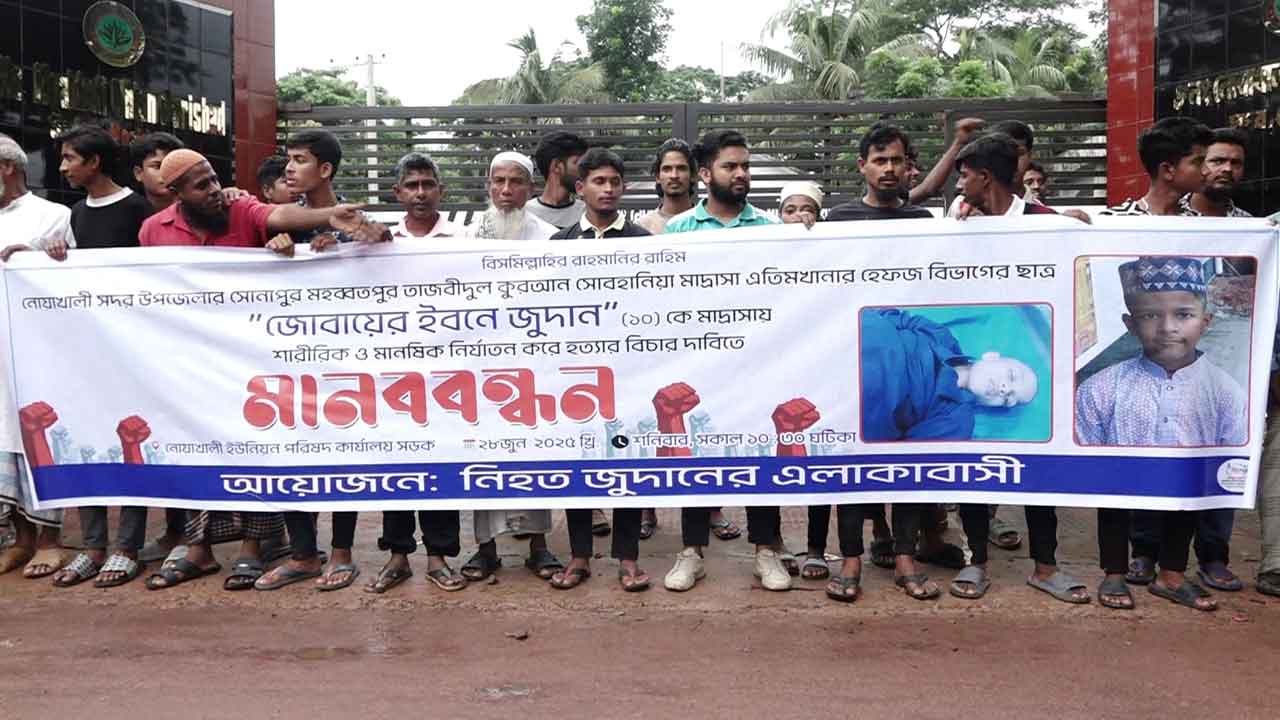 নোয়াখালী সদর উপজেলায় মাদরাসা ছাত্র জোবায়ের ইবনে জুদানের হত্যার বিচার দাবিতে বিক্ষোভ-মানববন্ধন হয়েছে।