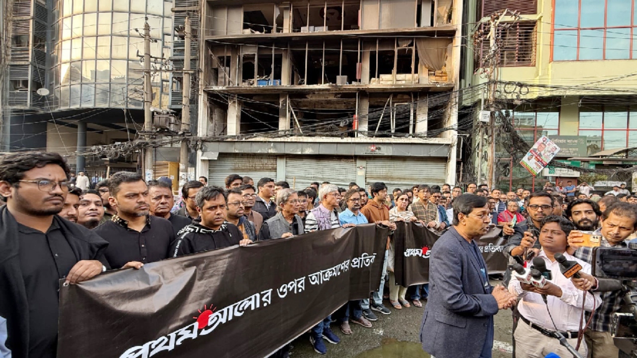 সিঙ্গাপুরে চিকিৎসাধীন অবস্থায় ইনকিলাব মঞ্চের আহ্বায়ক ও ঢাকা-৮ আসনের সম্ভাব্য স্বতন্ত্র প্রার্থী শরিফ ওসমান হাদির মৃত্যুর খবরের পর রাজধানীর কারওয়ান বাজারে দৈনিক প্রথম আলোর কার্যালয়ে হামলা ও অগ্নিসংযোগের প্রতিবাদে মানববন্ধন