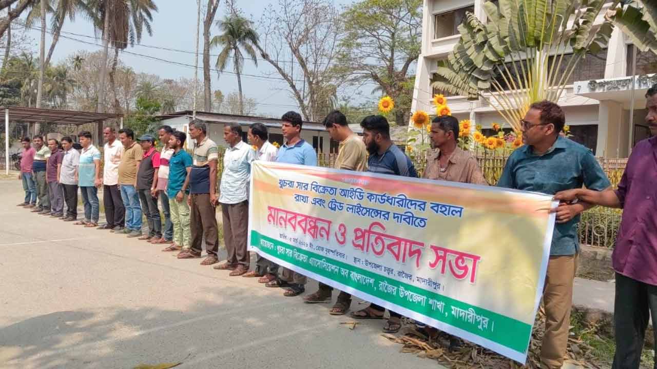 লাইসেন্স বহালের দাবিতে মাদারীপুরে খুচরা সার বিক্রেতাদের মানববন্ধন