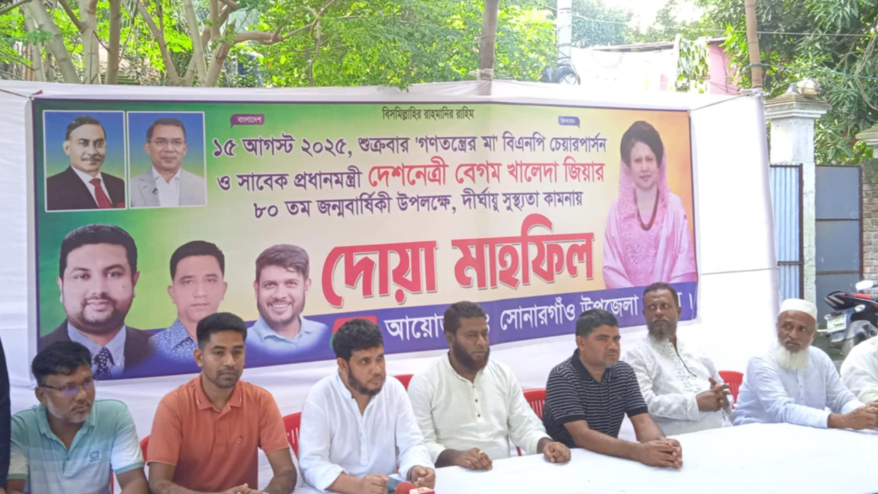 বিএনপির চেয়ারপারসন ও সাবেক প্রধানমন্ত্রী বেগম খালেদা জিয়ার জন্মবার্ষিকী উপলক্ষে নারায়ণগঞ্জের সোনারগাঁ উপজেলায় যুবদলের উদ্যোগে এক দোয়া মাহফিল অনুষ্ঠিত হয়।