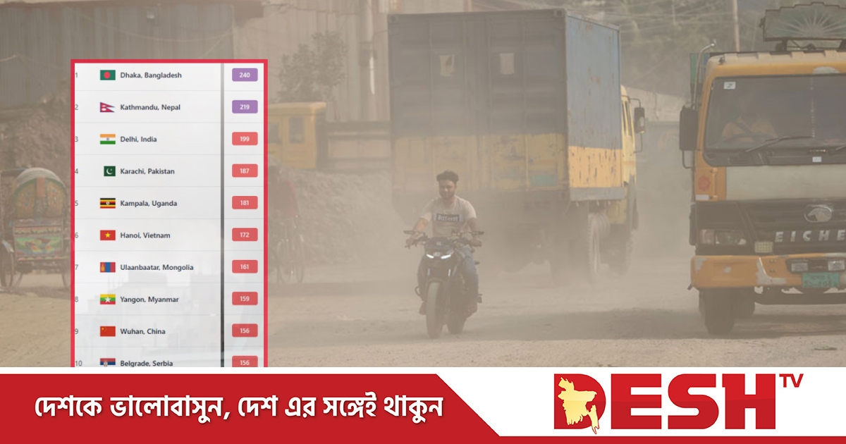 সাপ্তাহিক ছুটির দিন আজ শুক্রবারেও বায়ুদূষণের তালিকায় শীর্ষে রয়েছে বাংলাদেশের রাজধানী ঢাকা। এয়ার কোয়ালিটি ইনডেক্সে ২৪০ স্কোর নিয়ে বাতাসের মান ‘খুবই অস্বাস্থ্যকর’ পর্যায়ে রয়েছে।